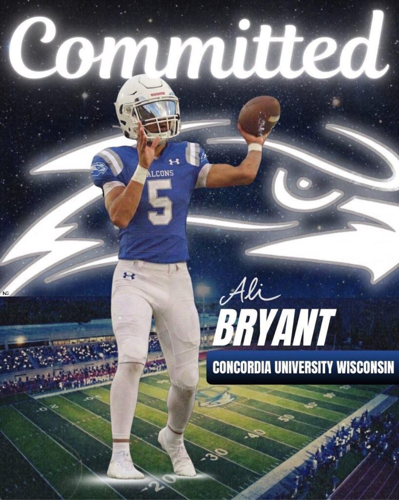 Navarre Raiders Quarterback Ali Bryant (Class of 2026) has committed to further his education and play football for the Falcons of Concordia University Wisconsin. CUW is located in Mequon, WI.